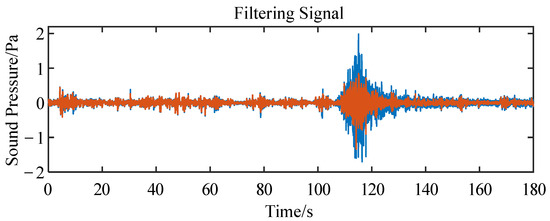 The response frequency range of the infrasound sensor is 0.1–1000 Hz, that is, in the actual signal acquisition, part of the signals collected by the sensor will be greater than 20 Hz in frequency. As only the signals no more than 20 Hz in frequency were analyzed in this study, signals larger than 20 Hz in frequency need to be removed through filtering. The filter adopted the window function design method and, specifically, the Kaiser window with high adaptability. The filtering effect is shown in Figure 13.