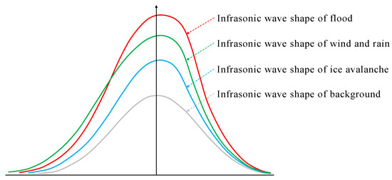 Different kinds of events have some differences in waveform. Figure 14 is a schematic diagram of the waveform based on the kurtosis and skewness in Table 3. As shown in Figure 14, the gray curve in the figure is the waveform feature of background noise, which basically shows a standard normal distribution, and the waveform of the flood event (red curve in the figure) has the maximum kurtosis of 8.33; therefore, it is steeper than those of other events and has a skewness of −0.13, that is, showing a left trailing phenomenon, which is slightly slighter than that of wind-and-rain events (green curve in the picture). The waveform of wind-and-rain events has a skewness of −0.16 and shows a more obvious characteristic of left trailing among the three kinds of events. In comparison, the waveform of the ice avalanche event has kurtosis and skewness (the blue part in the figure) less obvious than those of the other two kinds of events. In addition, there are overlaps between the three kinds of events and background noise in frequency range, which makes it difficult to remove the background noise. But, the background noise is very small in sound pressure and has little impact on the events. Therefore, there was no specific processing to remove the background noise in this study.