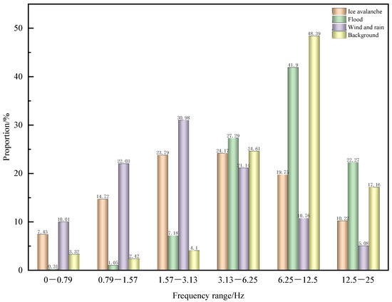 In terms of frequency distribution characteristics, avalanche events, flood events, and wind-and-rain events are mainly distributed in the frequency ranges of 1.5–9.5 Hz, 3–12.5 Hz, and 0.5–6.5 Hz, respectively, while background noise is mainly concentrated in the frequency range of 3–12.5 Hz. As shown in Figure 15, these events have certain overlaps among each other and overlaps with background noise, but they also differ some in frequency characteristics.