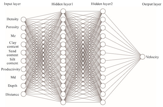In this article, we used DNN to establish a predictive model for the velocity of sound. The total dataset had 77 stations and was divided into the training data and the test dataset. The training data included 65 points, and the test data had 12 points. To avoid overfitting, the dataset was randomly assigned, and we used a test set as an estimate. The input features were wet bulk density; porosity; sand, silt and clay content; mean grain size (Mz); median size (Md); distance to the nearest coast; water depth and annual average primary productivity, for a total of 10 input features (Figure 1 and Table 1). Therefore, the training matrix was a 65 × 10 matrix, the training label (the corresponding measured velocities of sound) was a 65 × 1 vector, the test data were a 12 × 10 matrix and the test label was a 12 × 1 vector.