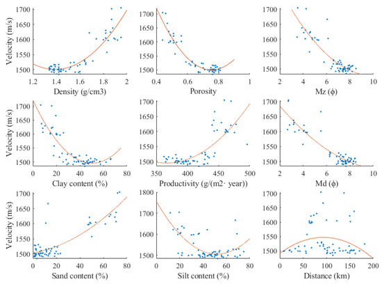 The correlations between the input parameters (density, porosity, mean grain size (Mz), clay content, productivity, median particle size (Md), sand content, silt content, and distance to the source) and the velocity of sound.