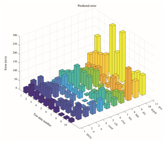 To verify the accuracy of the DNN model, we used 10 test data points from different area for testing, and the results are shown in Figure 4. The comparison between DNN and the conventional regression method for predicting the velocity of sound are shown in Table 3. From Figure 4, we can see that the predicted values of the DNN model had the same trend as the real measured values, and the error was small. In Table 3, we tested the regression equation’s error with the data from the test stations, and the results showed that the velocity of sound–porosity relationship had the highest accuracy among the correlations. The standard deviation (STDEV) of the velocity–porosity regression was 22.66, and the root mean square error (RMSE) was 38.54. Compared with these correlations, the DNN model had more accuracy: the STDEV of the DNN model was 17.67 and the RMSE was 33.73, which shows that the DNN model is more accurate than the regression equations for predicting the velocity of sound.