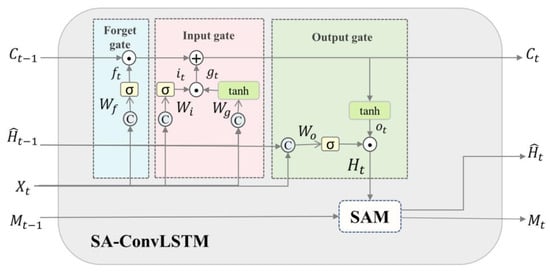 where represents the input at time t, represents the input state at time t − 1, and represent the output at time t, and SA represents the SA-ConvLSTM processing.