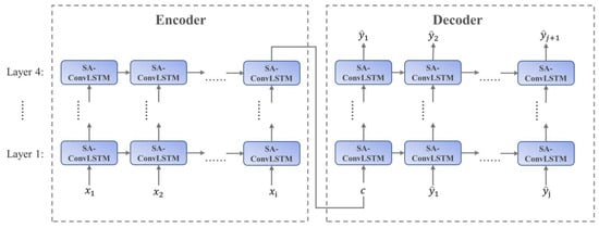 In this study, the SA-ConvLSTM model adopts the Seq2Seq structure (Figure 4). Following parameter adjustment, the model now consists of 4 stacked layers of SA-ConvLSTM, with a total of 8 self-attention nodes and a patch size of 4. The batch size is set to 2, and a 3 × 3 convolution kernel is utilized within the model.