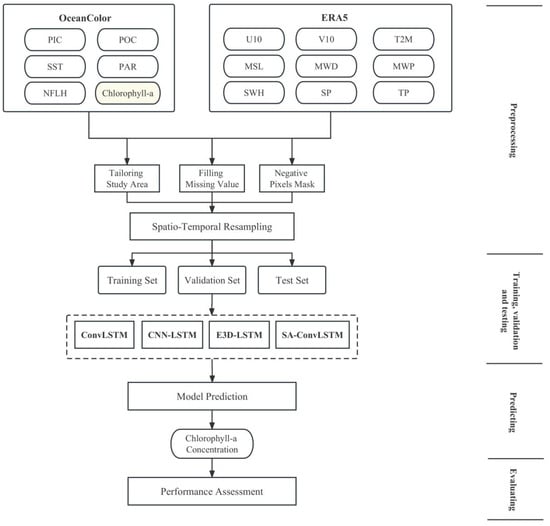 This work can be divided into four parts: data preprocessing, model training, data prediction, and model evaluation. In the current study, 14 kinds of data from OceanColor and ERA5 are used to predict Chl-a. The Chl-a dataset is formed after preprocessing, such as study area clipping, missing value imputation, masking, and resampling. The complete Chl-a dataset is divided independently into training, validation, and testing sets. Four models (ConvLSTM [], CNN-LSTM, E3D-LSTM [], and SA-ConvLSTM []) are employed to train and predict Chl-a. The weights of the model are trained using the training set, while the performance of the model is evaluated and compared using the validation and testing sets. The flow chart is shown in Figure 5.