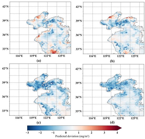 The predicted deviation plots of chlorophyll-a concentrations in May 2021 by different models. The predicted deviation is obtained by subtracting the actual values from the predicted values. The regions underestimated by the model are shown in blue, and the regions overestimated by the model are shown in red. (a) ConvLSTM, (b) CNN-LSTM, (c) E3D-LSTM, (d) SA-ConvLSTM.
