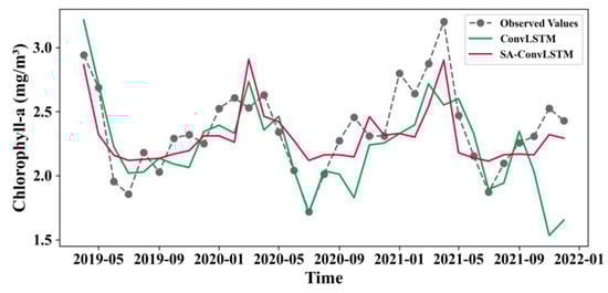 Figure 10 shows the variation curves of Chl-a prediction results over time for ConvLSTM and SA-ConvLSTM. Compared with ConvLSTM, the tendency of SA-ConvLSTM to learn Chl-a was closer to the change in true Chl-a. After introducing the SAM module, the ability of SA-ConvLSTM to learn the future Chl-a change trend by extracting the spatiotemporal information of the data was enhanced. In this study, a significant deviation was observed between the predicted and actual values of Chl-a concentrations for July and August 2020. The discrepancy might be attributed to the varying impacts of natural and anthropogenic factors on the marine environment each year []. The Chl-a concentrations in the YBS exhibit intricate characteristics due to the combined effects of a complex interplay among physical, chemical, and biological factors []. SA-ConvLSTM and ConvLSTM showed a downward trend in the Chl-a concentrations forecast for September to October 2020 due to the deviation, with ConvLSTM being more affected. From December 2020 to June 2021, the Chl-a concentrations increased first and then decreased rapidly. Chl-a decreased rapidly after reaching its maximum values in April 2021 and slowed down around May 2021. SA-ConvLSTM learned the trend of Chl-a, but Chl-a predicted by ConvLSTM reached its maximum values in March 2021. Similarly, from September 2021 to January 2022, the Chl-a concentrations first increased and then decreased. The changing trend in Chl-a learned by SA-ConvLSTM was consistent with the actual trend. However, ConvLSTM showed that Chl-a decreased to the minimum values and then increased during this period. In general, the tendency of SA-ConvLSTM to learn Chl-a was closer to the change in actual Chl-a.