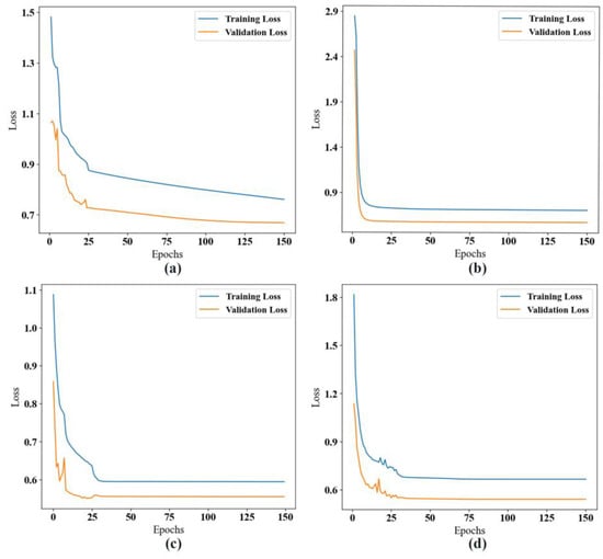Loss function plots for the four models predicting chlorophyll-a. (a) ConvLSTM, (b) CNN-LSTM, (c) E3D-LSTM, (d) SA-ConvLSTM.