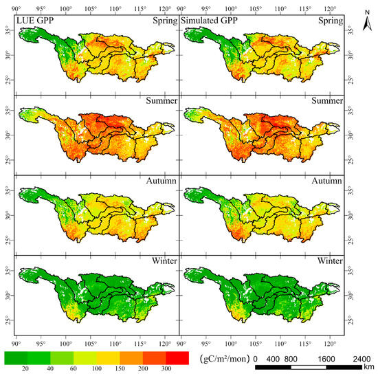 The spatial distribution of GPP is shown in Figure 6. In spring and autumn, the GPP in the Yangtze River Basin is mostly concentrated around 150 gCm−2mon−1; in summer, GPP is mostly concentrated around 300 gCm−2mon−1; in winter, the GPP is mostly less than 40 gCm−2mon−1. The regions with high GPP values are concentrated in the southwest and southeast of the Yangtze River Basin, Jialing River, and Hanjiang River.