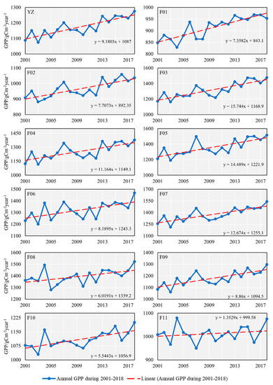 The changes in annual GPP in the different sub basins of the Yangtze River Basin are illustrated in Figure 5. In the whole Yangtze River, GPP increases with a slope of 9.18 gCm−2year−1a−1, and it shows obvious growth trends in the Jialing River, Wujiang River, upper trunk stream, Dongting Lake and Poyang Lake, with the slopes of 15.74 gCm−2year−1a−1, 11.16 gCm−2year−1a−1, 14.49 gCm−2year−1a−1, and 12.67 gCm−2year−1a−1, respectively, while in Taihu Lake, GPP shows less growth trend within the slope of 1.35 gCm−2year−1a−1. In general, the GPP in the Yangtze River Basin shows an increasing trend, but the increasing trends are different in different sub basins.