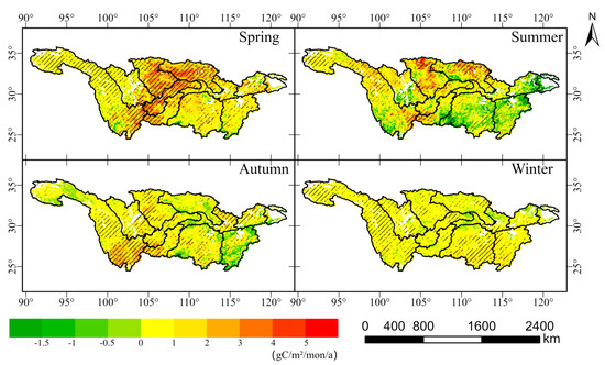 To further identify the historical trends of GPP changes in the Yangtze River Basin during different seasons, the slopes of the monthly mean GPP changes in different seasons are investigated as shown in Figure 7. The results show that the changing trends of GPP in the Yangtze River Basin are most obvious in spring, and the regions with significant increases occupy a large space, among which the growth trend is most significant in the Jialing River, Hanjiang River, and the upper trunk stream at greater than 3 gCm−2mon−1a−1; in summer, the regions with significant growth are only concentrated in the Jinsha River, Jialing River, and part of Hanjiang River, while Dongting Lake and Poyang Lake have a certain decreasing trend. In autumn, the regions with significant increases are concentrated in the southwest of the Yangtze River Basin, with a growth slope of 2–3 gCm−2mon−1a−1. In winter, the growth trend of GPP in the entire basin is slight and concentrated at 0–1 gCm−2mon−1a−1.