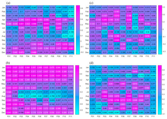 The sensitivities of monthly GPP to different climate factors are shown in Figure 8. Figure 8a shows that GPP increases as CO2 enrichment in nearly all the months, and GPP is most sensitive to elevated CO2 in spring (April, May) and October, November, and December in the Yangtze River Basin. The highest sensitivity coefficient ranges between 0.389 (Jinsha River) and 0.651 (Jialing River) in the basin. The sensitivity of GPP to temperature (TEMP) changes is shown in Figure 8b indicating an obvious negative correlation from late spring (May) to autumn (October) and positive correlation from winter (November) to spring (April) in most subregions. The highest positive coefficient ranges between 0.25 (Taihu Lake) and 0.683 (Hanjiang River), while the lowest negative coefficient ranges between −0.948 (upper trunk stream) and −0.378 (Taihu Lake). The sensitivity of GPP to precipitation (PREC) shows more complexity with significant spatial–temporal variance with both positive and negative correlation ranges between −0.34 and 0.32. Figure 8d shows the sensitivity of GPP to solar radiation. The results show almost a positive trend with solar radiation (SRAD) in the basin and it is most sensitive to solar radiation from May to November, especially in the Jialing River (0.893), Wujiang River (0.765), upper trunk stream (0.799), Dongting Lake (0.737), Hanjiang River (0.843), and Poyang Lake (0.763).