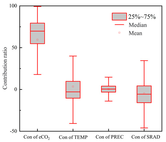 The box plot of elevated CO2 (eCO2), TEMP, PREC, and SRAD contribution to GPP.