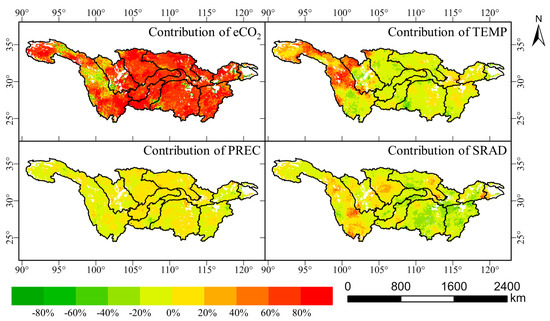 Spatial distribution map of elevated CO2 (eCO2), TEMP, PREC, and SRAD contribution to GPP.