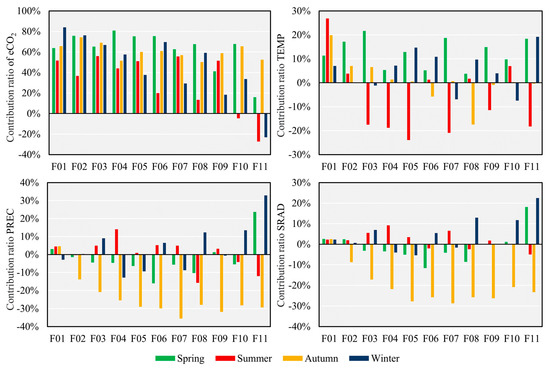 The contribution of elevated CO2 (eCO2), TEMP, PREC, and SRAD to GPP in different seasons.