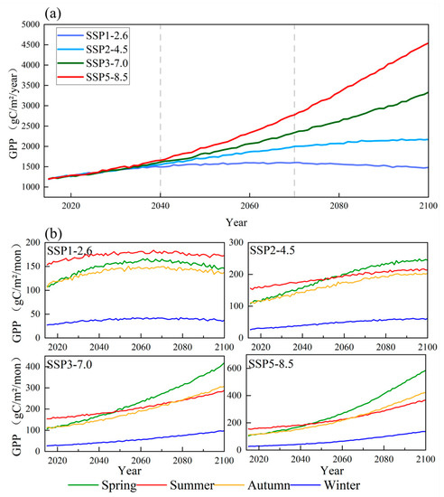 Projected future annual GPP (a) and seasonal GPP (b) changes in the Yangtze River Basin under different scenarios.