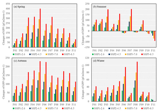 Under SSP5-8.5 scenario, the following is shown: in spring, the area below 100 gCm−2mon−1 accounts for about 15%, and most of them are concentrated in the Jinsha River; the area between 100~300 gCm−2mon−1 accounts for about 15%, and the area above 300 gCm−2mon−1 accounts for about 60%, most of which are concentrated in the Jialing River, upper trunk stream, and Hanjiang River. In summer, the area below 200 gCm−2mon−1 accounts for about 40%, mostly concentrated in the Poyang Lake, Dongting Lake, and the lower reaches of the Yangtze River; the area between 200 and 300 gCm−2mon−1 accounts for about 15%, mostly concentrated in the Jinsha River. The area above 300 gCm−2mon−1 accounts for about 45%, mostly concentrated in the Jialing River and the Hanjiang River. In autumn, the area below 100 gCm−2mon−1 accounts for about 20%, and most of them are concentrated in the Jinsha River; the area between 100~300 gCm−2mon−1 accounts for about 40%, and the area above 300 gCm−2mon−1 accounts for about 40%, and most of them are concentrated in the southwest of the basin, the upper trunk stream, and Dongting Lake; in winter, 70% of the regions have GPP below 100 gCm−2mon−1.