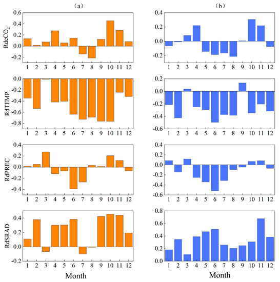 At annual scale, GPP shows an increasing trend in the Yangtze River Basin, which can be observed almost globally and is consistent with many previous studies [32,33]. However, GPP in the Yangtze River Basin does not maintain an increasing trend throughout the year at seasonal scale, and it increases mainly in April and May. Based on the sensitivity and contribution analysis of GPP, it can be seen that the main factor affecting the changes in GPP in spring is elevated CO2, indicating that elevated CO2 dominates the GPP changes in the Yangtze River Basin. At the same time, it can be seen that the impact of elevated CO2 on GPP is mainly concentrated in spring and autumn, and the reason for the smaller increase in GPP in autumn is that the negative effects of precipitation and solar radiation offset a portion of the positive effects of elevated CO2. From previous studies, it can also be seen that the fertilization effect of carbon dioxide is the most important factor in increasing vegetation productivity [34,35]. The increase in CO2 concentration can enhance photosynthesis by controlling the closure of stomata and improving water use efficiency [36]. Figure 16 shows the correlations between the sensitivity of GPP to elevated CO2 (deCO2), temperature (dTEMP), precipitation (dPREC), and solar radiation (dSRAD) with temperature and precipitation in different months. It can be observed that the impact of elevated CO2 on GPP is highest in spring when temperatures warm up and vegetation begins to grow. This may be due to the fertilization effect of carbon dioxide improving the water use efficiency of vegetation, leading to a significant increase in GPP. It can also be seen that in summer, when there is more precipitation, the correlation between deCO2 and precipitation shows negative values. The more precipitation, the less obvious the response of GPP to carbon dioxide fertilization in regions, which can also prove that the fertilization effect of CO2 mainly affects vegetation during periods of water scarcity. At the same time, there is also a certain correlation between deCO2 and temperature, mainly showing a positive correlation, which proves that an increase in temperature is beneficial for enhancing the fertilization effect of carbon dioxide. However, a negative correlation in summer also indicates that there is an optimal temperature. If the temperature is too high, it may inhibit the fertilization effect of carbon dioxide. In addition, the prolonged growth season of vegetation due to temperature rise further strengthens the fertilization effect of carbon dioxide.