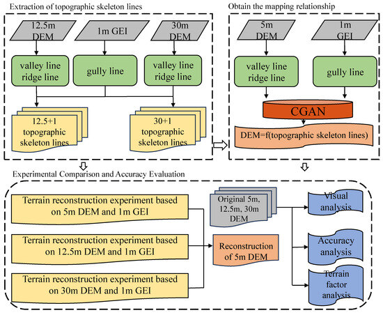 The overall workflow is shown in Figure 1. Firstly, ridge and valley lines were extracted using the original 5 m DEM, and gully lines were extracted using GEI. Moreover, ridge lines, valley lines, and gully lines were fused to obtain the mapping relationship between the DEM and the skeleton line, using CGAN. Then, ridge and valleys lines were extracted using the 12.5 m and 30 m DEMs and were separately fused with gully lines extracted from GEI. Finally, the 5 m DEM was reconstructed by merging three terrain datasets through a created mapping relationship. A visual analysis, accuracy analysis, and terrain factor analysis were carried out on the reconstructed DEM, as well as the original 5 m, 12.5 m, and 30 m DEMs.
