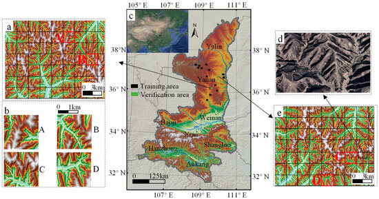 The Loess Plateau in Shaanxi Province, China (Figure 2c), was selected as the study area. The study area forms gullies and rugged landscapes due to the complex climate, loose soil, wind, and rainfall erosion, thereby complicating terrain modeling [44,45]. This selection allows the model to tackle complex terrain whilst confidently validating the outcome. Multi-scene 5 m DEMs of the Loess Plateau were selected to address the large volume of training samples needed (Figure 2c) and verified training effectiveness on the DEMs of two scenes, the Ganquan County area (Figure 2a) and the Yanchuan County area (Figure 2e), which were divided into 112 sample areas that represented the unique Hills and Gullies terrain of the Loess Plateau, respectively. Only four sample areas are displayed (Figure 2b) due to the limited size of the paper.