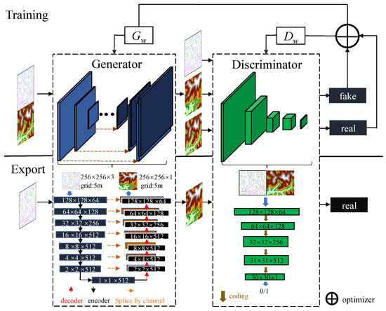 A network model based on CGAN and pix2pix was used in this paper [29,30] (Figure 3). CGAN comprises a generator and a discriminator, with the generator creating the image and the discriminator determining the similarity between the image generated by the generator and the original image. In addition to inputting random noise, CGAN differs in that it also adds control conditions such as topographic skeletons to enhance terrain control. The terrain is continuous; thus, terrain details must be preserved during down-sampling to maintain the topographic skeleton. The generator uses the U-Net structure to input the topographic skeleton into each layer of the down-sampling process [29] and adds a skip-connection layer between the input and output matching codecs to enhance feature maps and conditions. The computer vision technique generally processes RGB images. However, the DEM is a single-band image matrix; therefore, the output must be modified to one band in the final convolution layer of the generative model. The loss function of the generator needs an error function to compare the generated DEM to the original, and the total loss function of the generator is as follows: