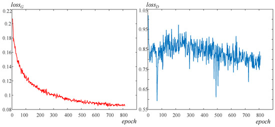 This article obtained about 2000 samples after cropping the existing 5 m DEM data of the Loess Plateau, set the batch size to 5, and used the Adam optimizer (with a learning rate of 0.002, a β1 of 0.5, and a β2 of 0.999), and the number of epochs was 600. Because DEM and the RGB images in computer vision are different, this article set the weight of the L1 loss in the generator loss function to 99. The generator’s loss function and the discriminator’s loss function curve are shown in Figure 4.
