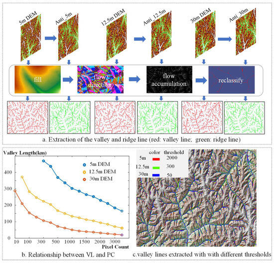 This study selected the hydrological analysis method [46] to extract ridge and valley lines (Figure 5a). The hydrological analysis method uses pixel elevation and searches for the lowest value of raster element amongst the eight surrounding neighborhoods as the outlet. The method involves puddle filling, flow direction calculation, flow accumulation calculation, and river network classification. The extraction of the ridge line is similar to the valley line of the inverse DEM. The extraction of the hydrological analysis method depends on the flow accumulation. A substantially small threshold value for extracting an excessive number of elements affects the network grading, whilst a substantially large threshold inadequately represents the details. Li et al. [30] found that the extraction of ridge and valley lines using a 5 m DEM threshold of 2000 (catchment pixels) has a superior effect on topography control in the Loess Plateau. The valleys extracted by different-resolution DEMs for the same number of catchment pixels vary significantly. From Figure 5, we see that the lengths of valley extracted from the 5 m DEM with a threshold of 2000 are close to those extracted from the 12.5 m DEM with a threshold of 300 and the 30 m DEM with a threshold of 50. Therefore, in this paper, ridge and valley lines are extracted with the 5 m DEM threshold of 2000, the 12.5 m DEM threshold of 300, and the 5 m DEM of 50. After transforming the ridge and valley lines obtained from DEMs of different resolutions to the same length, it is also necessary to convert the grid size to that of 5 m DEMs. The specific method is as follows: extract the ridge and valley lines after threshold conversion, and then resample the obtained skeleton lines to match the grid size of the training data.