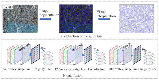 The gully lines were extracted by using an object-oriented analysis method that combines remote-sensing images and the DEM [47,48] in this study (Figure 6). In this study, the software named eCognition from the Trimble company was used for multiscale segmentation; we chose a multiscale segmentation scale of 120, a shape index of 0.1, and a tightness of 0.5. The ridge and valley lines of the three-resolution DEM, as well as the gully lines from the GEI, were combined into a three-band matrix. To meet the training requirements of CGAN, the three-band matrix composed of the ridge, valley, and gully line needed to be combined with the corresponding 5 m DEM in the training dataset.