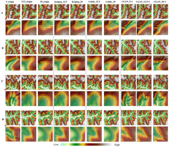 The traditional interpolation method uses mathematical rules for inferring unknown points’ values from the existing points. This method works well in the regions with flat terrain. The deep-learning method proposed in this paper is dependent on the terrain skeleton, so it is more effective in regions where the terrain skeleton is obvious (i.e., mountainous areas) but less effective in regions where the terrain skeleton is unobvious (i.e., a chain of undulating hills without obvious ridge and gully). The traditional interpolation method makes it hard to increase the additional information into the original data, while the deep-learning method has established a nonlinear fitting relationship through a large number of training data, and can add information through the established mapping relationship between the terrain skeleton and the DEM, which makes it possible to recover the terrain. This also explains the superior results of the deep-learning method. Table 4 demonstrates the difference between the deep-learning method in this paper and the interpolation method.