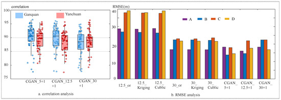 Accuracy evaluation. (a) The correlation between the DEM generated by three deep-learning methods and the original 5 m DEM was calculated using 112 samples from two validation areas. (b) Comparison analysis of the RMSE between the original 12.5 m and 30 m DEMs, interpolated 12.5 m and 30 m DEMs into 5 m, three deep-learning methods, and the original 5 m DEM.