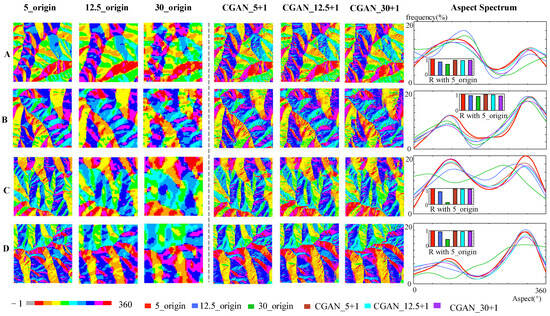 Aspect comparison. Comparison of aspect map and aspect spectrum generated by three deep-learning methods and three data sources. R with 5_origin refers to the correlation between the aspect spectrum extracted from the original 5 m DEM and other data. ((A,B): two Validation Sample Areas in Ganquan County; (C,D): two Validation Sample Areas in Yanchuan County).