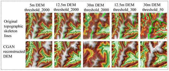 Although the ridge and valley lines at the same length constrain the generation of the terrain, it can be seen through Figure 11 that the 12.5 m and 30 m DEMs are still greatly distorted when utilizing the same length of skeleton lines as the 5 m DEM. Therefore, further work is needed, which is performed by refining the skeleton lines extracted from the 12.5 m DEM and 30 m DEM to obtain the same grid size of skeleton lines as that of the 5 m DEM. Figure 12 illustrates the terrain reconstructed by CGAN with different DEM resolutions at similar spatial locations and the same length of the river valley. When the difference in image elements between the 5 m grid and the training image element is large, the generated topography offset is high, resulting in a poor reconstruction effect. Therefore, refining the topographic skeleton lines of other resolution DEMs to the same grid size as the 5 m DEM is necessary.