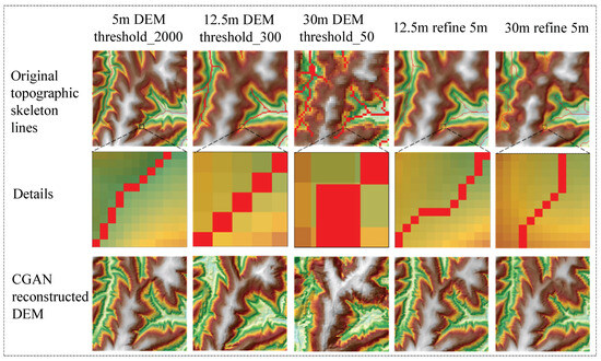 Influence of the grid size. Original topographic skeleton lines refer to extracting valley lines from DEMs. Details refer to the pixel-level details of the DEM. CGAN-reconstructed DEM refers to DEM reconstructed by inputting terrain skeleton into the CGAN network.