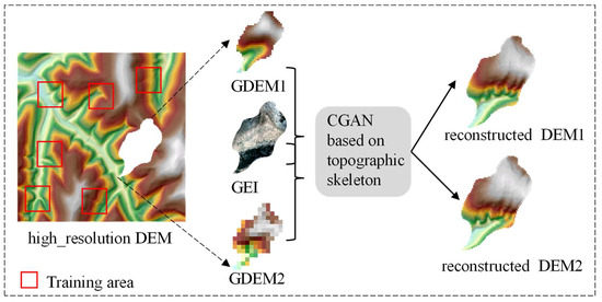 This paper presents a framework for reconstructing high-precision DEM, using GEI, GDEM, and CGAN, which utilize feature-recovery details in computer vision. Topographic skeletons (valley, ridge, and gully lines) were extracted from GDEM and GEI. These elements are used as constraints to generate the DEM, using the CGAN model. Different combinations of topographic skeletons extracted from 5 m, 12.5 m, and 30 m DEMs and 1 m GEI were compared for reconstructing 5 m DEMs. The generated DEM is evaluated on the basis of its visual effect, accuracy analysis, and terrain factor analysis. The experiment’s results show that the 5 m DEMs generated with the three deep-learning methods are all similar to the original 5 m DEM (reference data), which provides a markedly increased level of terrain detail information when compared to the traditional interpolation methods. From the perspective of elevation accuracy, the correlation of reconstructed DEMs from three deep-learning methods to the original 5 m DEMs exceeds 0.9, while the vertical accuracy of the 12.5 m + 1 m combination is obviously higher than that of the 30 m DEM + 1 m GEI combination. From the perspective of topographic factors, the distribution trends of the reconstructed 5 m DEM are all close to the reference data in terms of the extracted slope and aspect. This study enhances the quality of open-source DEM and introduces innovative ideas for producing high-precision DEMs. In regions where the field survey of high-precision DEMs is difficult, open-source DEMs combined with GEI can be used in high-precision DEM reconstruction.
