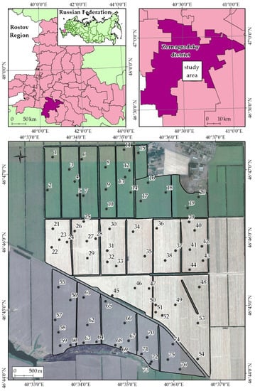 The research was carried out on the territory of an agricultural farm with an area of 2215 ha in the Zernogradsky District of the Rostov Oblast (Figure 1). The elevation in the studied site ranged from 50 to 100 m a.s.l. The dominant soils are ordinary chernozems (Haplic Chernozem), medium-thick, carbonate, low-humus, clayey on loess-like clays. The average annual air temperature is 9.3 °C, the sum of active air temperatures (above 10 °C)—3000–3350 °C, and the average annual precipitation—486 mm. The climate of the study area is characterized as temperate continental with mild winters and hot summers or as hot-summer humid continental (Dfa) according to the Köppen climate classification []. The Rostov Oblast is an important agricultural region (it produces ~4.6% of all crop and livestock products, or 2nd place within the Russian regions). A high degree of agricultural development (85% of the region’s territory) and frequent land cultivation leads to intensification of various negative/degradation soil processes. Slitization [,] and erosion [] have become widespread. The average soil loss caused by water erosion is 0.83–2.64 mm/yr (6.9–22.0 t ha–1/yr) for arable lands, and deflation rates can reach 55–126 t ha–1/yr [].