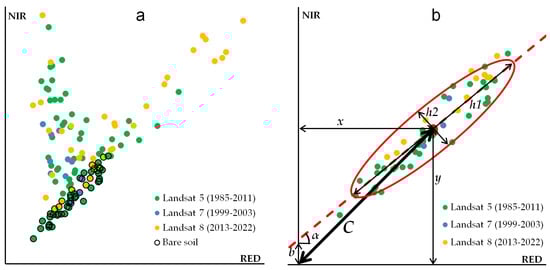 (a) Multitemporal plot of the RED-NIR values distribution for one point in an agricultural field. (b) MSL coefficients (C—distance from the center of the ellipse to the origin of the RED-NIR spectral space; a—tg(α)—tangent of the soil line’ slope; b—offset along the ordinate axis; x—RED coordinate; y—NIR coordinate; h1—length of the major axis of the ellipse; h2—length of the minor axis ellipse approximation; red ellipse—ellipse approximation of the values of BSS multitemporal spectral characteristics in the RED-NIR spectral space).