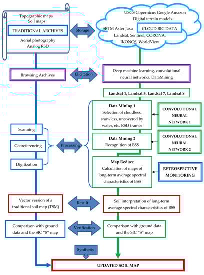If the need to update large-scale ASMs is beyond doubt, then different materials and methods for obtaining relevant soil information are offered: traditional ground/field investigations [], modeling [,,,] based on the processing of digital elevation models (DEMs) [,,,,,] and climate data [,], processing of RSD. Most researchers tend to use the RSD. Several researchers use RSD in the form of vegetation indices (VI, VIs—in the plural) [,,,,,,,]. Others use the bare soil surface (BSS) characteristics [,,,,,,,,,,]. Still others use ground-based spectroscopy [].