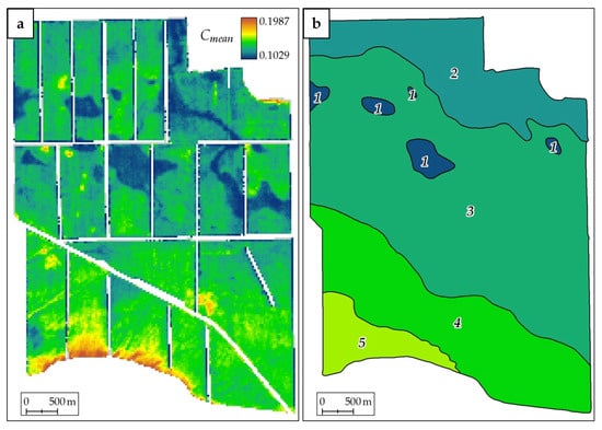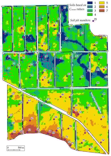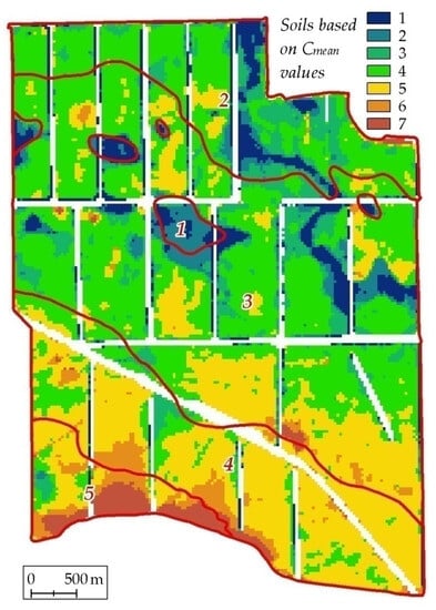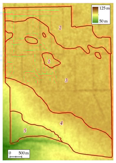 One way to describe the spatial heterogeneity of agricultural lands is soil cartography [,]. Soil maps of large scales (1:10,000, 1:25,000) can divide an arable field into several fragments/contours. Each contour of a large-scale soil map contains, as a rule, information on the content of organic matter, the thickness of the humus–accumulative horizon, particle size distribution, acidity, and so on; such properties are usually different from adjacent contours. Without soil maps, it is difficult to implement the concept of landscape-adaptive agriculture []. Large-scale soil maps obtained by traditional ground surveys are currently the most widely used [,]. Conventional large-scale soil maps (including those processed into vector format) were created, as a rule, more than 30 years ago [] and need to be updated []. Some studies show that in agricultural mapping, soil maps contribute more to the quality of modeling than remote-sensing data (RSD) [,].