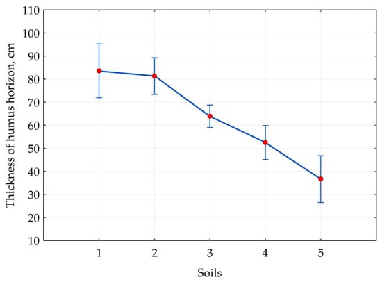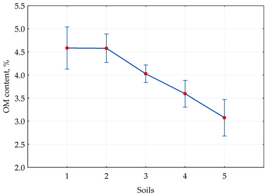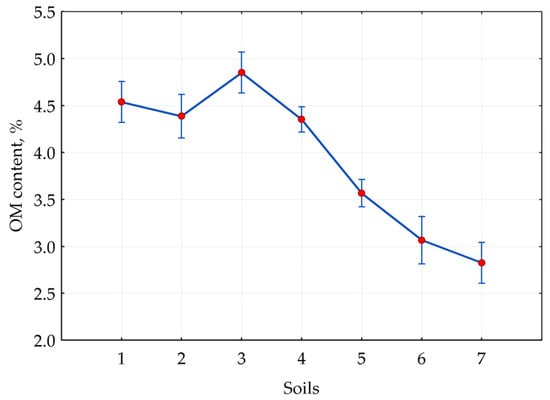 When describing the soil profiles and using the values of the OM content in the plow layer and the thickness of the humus horizon, the type and subtype of soil and the presence of degradation were determined. Degradation was understood as a decrease in the thickness of the humus horizon and/or a decrease in the content of OM in the plow layer in relation to the typical A+AB depth and humus content of the soil for the study region.