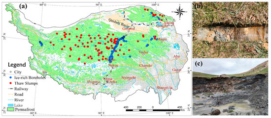 The distribution of high ice-content permafrost sites on the Qinghai–Tibet Plateau. (a) High ice-content permafrost boreholes (iv > 25%) sites and parts of the thaw slumps areas exists. (b) High ice-content permafrost found in boreholes. (c) Thaw slump with high ice content.