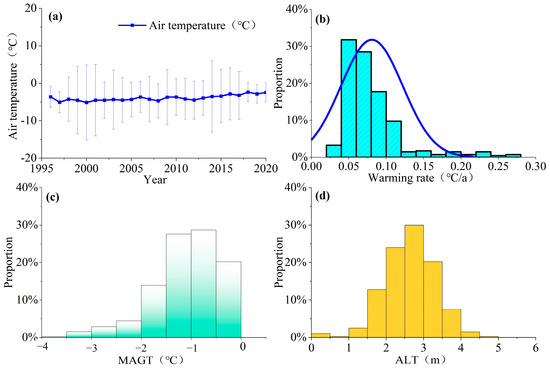 Statistical figures of different temperatures and active layer thickness (ALT) of high ice-content permafrost. (a) Mean annual air temperature change with an average warming rate of 0.08 °C/a; (b) histogram of warming rates from 1996 to 2020; (c) histogram of mean annual ground temperature (MAGT); (d) histogram of active layer thickness (ALT).