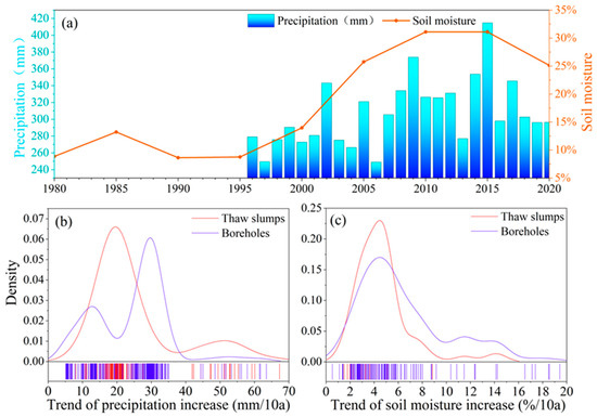 Variation in precipitation and soil moisture in regions with high ice-content permafrost. (a) Variation of soil moisture and precipitation over time in the high ice-content region. (b) Density plots of the increase rate of precipitation in both borehole and thaw slumps; (c) density plots of the increase rate of soil moisture.
