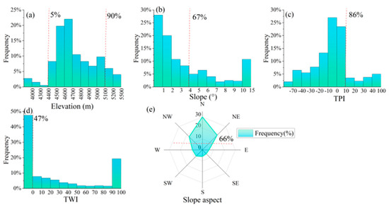Geomorphological features of the distribution of high ice-content permafrost. (a) elevation; (b) slope; (c) topographic position index (TPI); (d) topographic wetness index (TWI); (e) slope aspect.