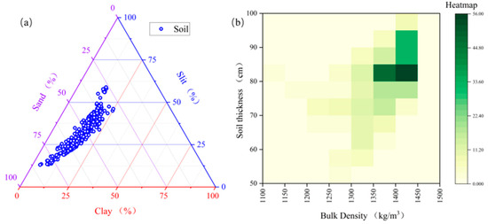 Soil properties of high ice-content permafrost. (a) Soil clay, silt, and sand content; (b) heatmap of soil layer thickness and soil bulk density.