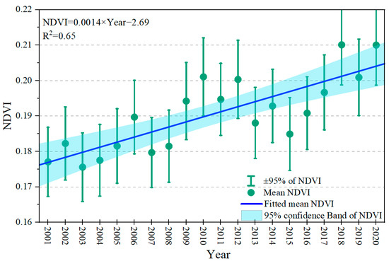 In permafrost regions, the growing of vegetation primarily occurs during the warm season. The average NDVI (Normalized Difference Vegetation Index) values for the growing season (May–September) on the QTP over the past two decades (2001–2020) were used to investigate the relationship between vegetation growth and high ice-content permafrost. In high ice-content permafrost area, the average NDVI was 0.175 in 2000 and 0.21 in 2020. The highest recorded NDVI value was 0.60 (observed in the east-central part of the QTP in 2018), indicating the presence of lush meadow vegetation. With warmer and wetter conditions on the QTP, the NDVI exhibits continuous fluctuations with an annual growth rate of 0.0014 per year (Figure 7). In general, vegetation within high ice-content regions showed growth and expansion. Furthermore, the entire plateau experienced an increasing trend in NDVI within the high ice-content regions due to climate change. The precise contribution of melted high-content ground ice to vegetation growth remains uncertain.