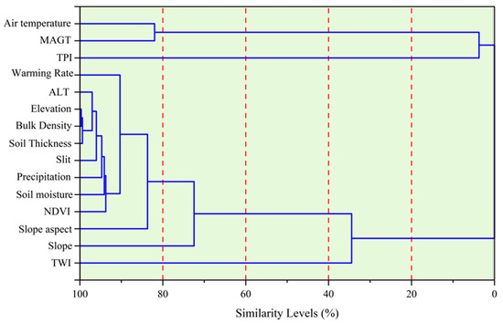 Previous analyses indicated significant environmental variations in high ice-content permafrost regions. Therefore, it is important to identify common environmental characteristics of high ice-content permafrost distribution that can serve as a foundation for future ground ice modeling. In this section, cluster analysis was utilized to evaluate 15 attributes of 400 high ice-content permafrost sites across the plateau, aiming to explore their interrelationships. The results revealed that elevation, bulk density, and soil thickness exhibited the highest similarity among the 400 high ice-content permafrost sites, whereas active layer thickness, soil properties, precipitation, and soil moisture displayed relatively lower similarities. Notably, the environmental attributes that exhibited similarity levels exceeding 90% included warming rate, active layer thickness, elevation, bulk density, soil thickness, soil content, precipitation, soil moisture, and NDVI (Figure 8). On the other hand, indicators such as air temperature, MAGT, and slope aspect demonstrated similarities ranging from less than 90% to more than 80%, while slope (76%), TWI (37%), and TPI (2%) exhibited substantial environmental disparities, reflecting significant environmental variability. The relatively low similarity between TWI and TPI can be attributed to variations in geomorphological settings, where there was a scarcity of data for topographic lows and catchments.