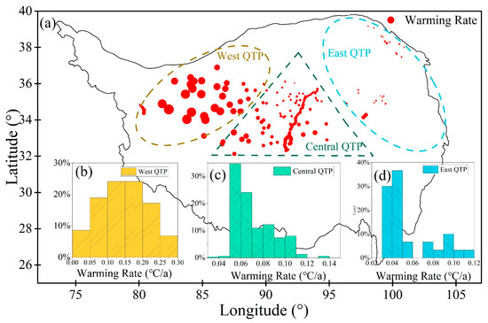 Distribution of warming rates of high ice-content permafrost regions on the QTP. (a) Whole QTP, with larger circle diameters denoting higher warming rates; (b) western QTP; (c) central QTP; and (d) eastern QTP.