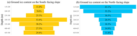 Regional topographic effects can also influence permafrost characteristics, and permafrost conditions may vary with changes in elevation, slope, and aspect [56]. Microtopography can also affect local variations in permafrost distribution and related terrain attributes [57,58]. According to Ishikawa’s observations in Mongolia, permafrost develops more often on northern slopes, while southern slopes and flat grasslands have rare permafrost development [59]. As for high ice-content permafrost, it is mostly found on the shady slopes (northeast, north, and northwest) of the mountainous terrain, accounting for 66% of the total distribution (Figure 5e). In Gushan, the Beiluhe Basin on the central QTP, ground ice at the top of the permafrost layer has degraded on the sunny slope but continues to accumulate on the shady slope [60]. Additionally, near the upper limit of permafrost, the ground ice content is much lower on the sunny slope compared to the shady slope, which reflects the influence of the slope aspect on solar radiation and reflection intensity, resulting in differences in the near-surface ice distribution (Figure 10).