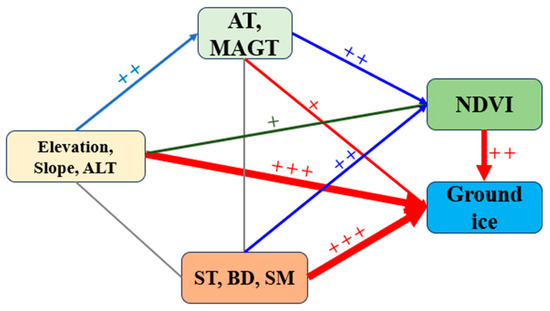 Assessment of the reliability of high ice-content permafrost, with a higher number of “+” signs signifying greater reliability. AT: air temperature; ST: soil thickness; BD: bulk density; SM: soil moisture.