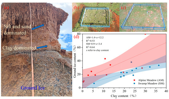 Map of viscous clay content in regions with high ice-content permafrost. (a) Material distribution profile of a typical thaw slump located in the Hol Xil Mountains; (b) Swamp meadow investigated using boreholes in the Beiluhe Basin; (c) Alpine meadow investigated using boreholes in the Beiluhe Basin; and (d) the relationship between clay content and ground ice content (volumetric ice content) in the two vegetation types of swamp meadow and the alpine meadow.